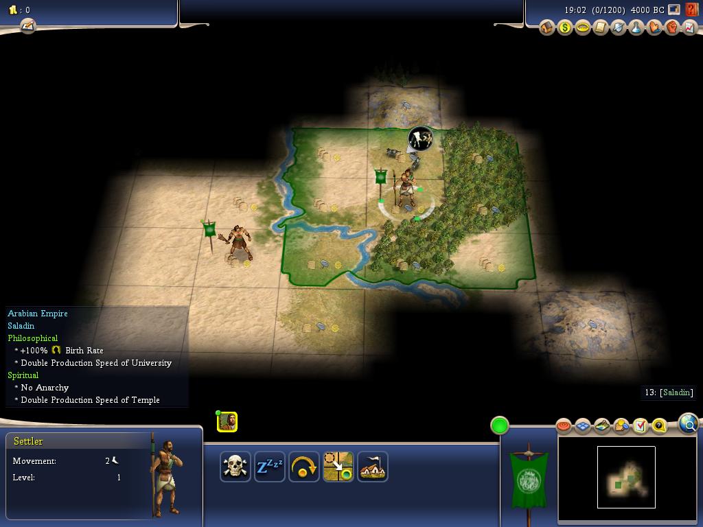 Saladin is Philosophical and Spiritual; starting with Mysticism and The Wheel. Your Philosophical trait doubles Great People birth rate and doubles production speed of University. Your Spiritual trait allows no anarchy and doubles production speed of Temple.