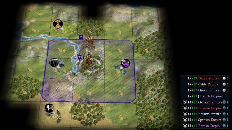 This game is a little unusual, in that you begin the game in contact with all of the AI. You and three of those AI are at Always Peace, so that none of you can go to war against any of the other three. The five other AI are at Always War, so that they will never make peace with anyone (including each other). The four peaceful civilizations all begin the game having learned Writing, so that they can communicate with each other. The five warmongers have disdained this skill; who would they want to write to?